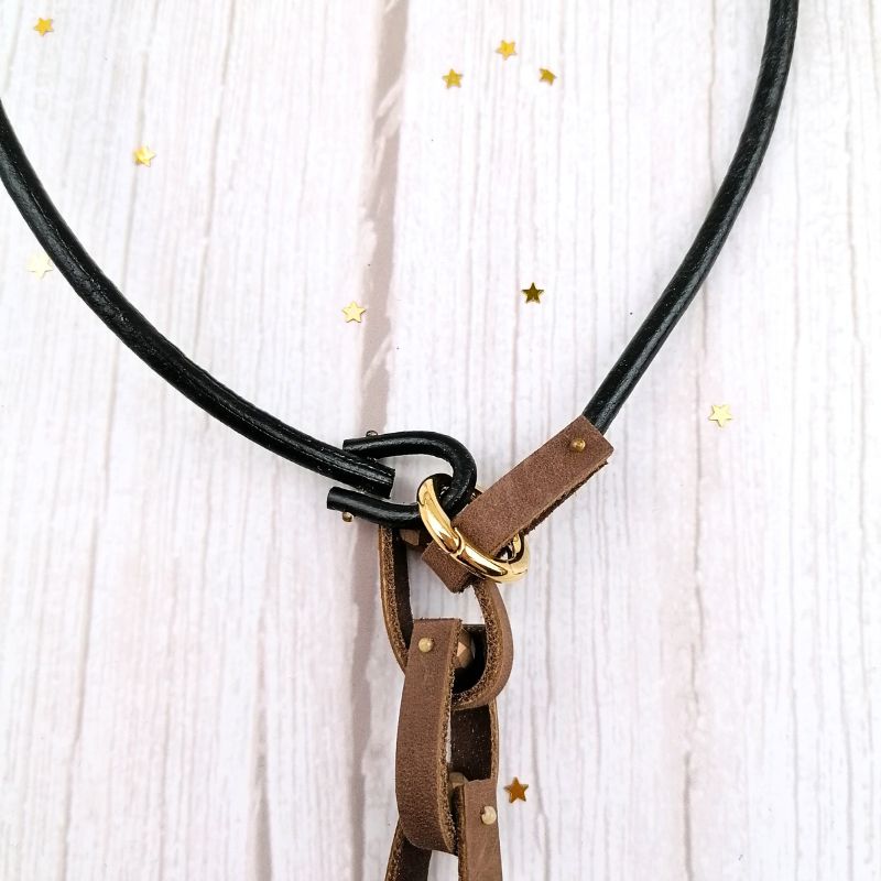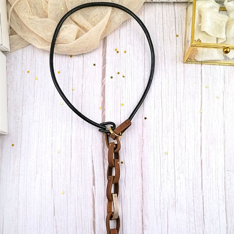 Δερμάτινο κολιέ με μπροστινή σύνθεση από δερμάτινα κομμάτια αλυσίδας σε καφέ αποχρώσεις, εμπλουτισμένες με μια διακριτική χρυσή λεπτομέρεια.