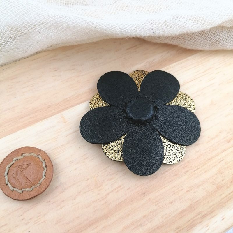 Μαγνητική καρφίτσα σε σχήμα λουλουδιού, κατασκευασμένη από φυσικό δέρμα σε χρυσή απόχρωση με ιδιαίτερη υφή.