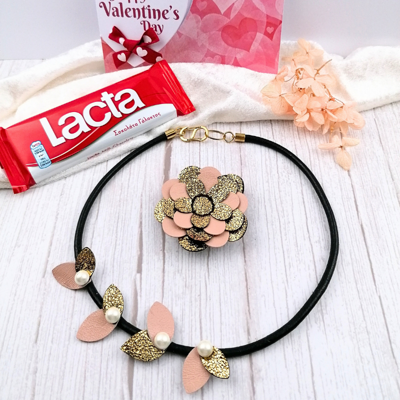 Ένα κομψό και θηλυκό σετ από τη Valentine Collection, που συνδυάζει κολιέ και μαγνητική καρφίτσα σε αρμονικές αποχρώσεις ροζ και χρυσού, κατασκευασμένα από δέρμα και σχεδιασμένα για διακριτικές αλλά ξεχωριστές εμφανίσεις.