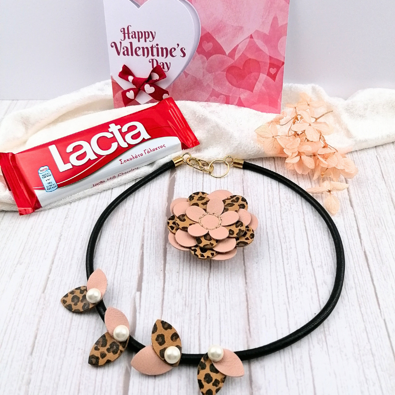 Σετ Valentine Collection – Κολιέ & Μαγνητική Καρφίτσα Ροζ & Λεοπάρ + Δώρο Ευχετήρια Κάρτα & Σοκολάτα