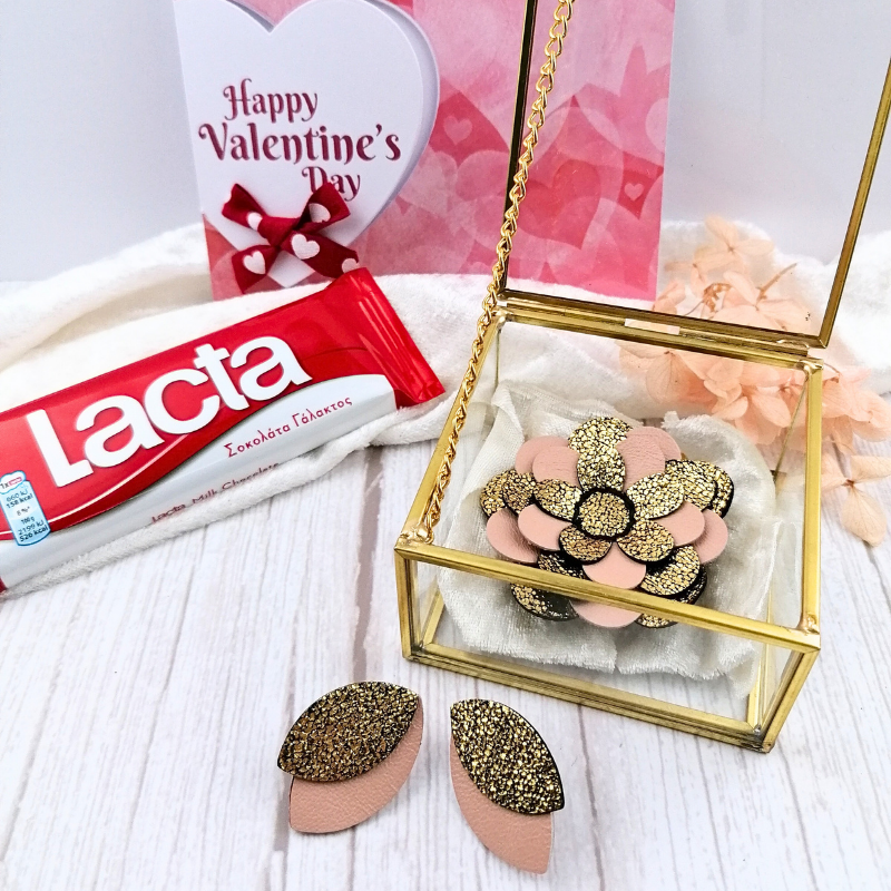 Σετ Valentine Collection – Σκουλαρίκια & Μαγνητική Καρφίτσα Ροζ & Χρυσό + Δώρο Ευχετήρια Κάρτα & Σοκολάτα