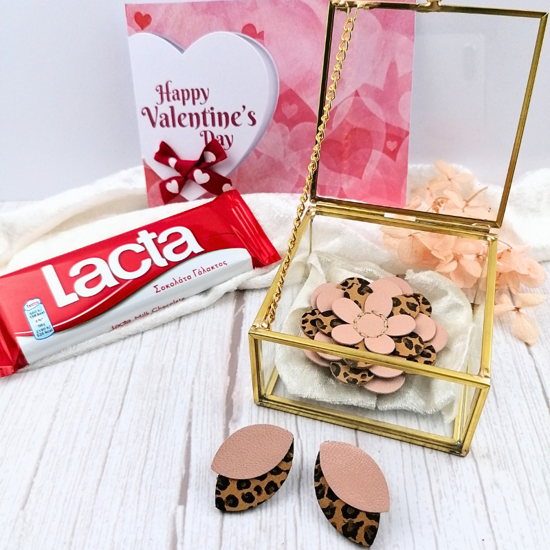 Σετ Valentine Collection – Σκουλαρίκια & Μαγνητική Καρφίτσα Ροζ & Λεοπάρ + Δώρο Ευχετήρια Κάρτα & Σοκολάτα