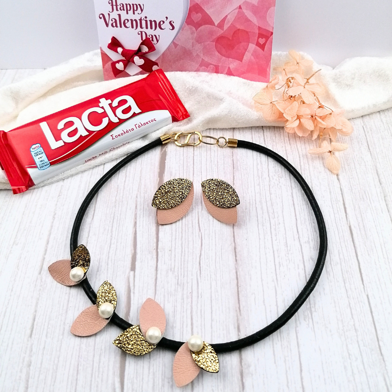 Ένα ολοκληρωμένο, ρομαντικό σετ από τη Valentine’s Collection, που συνδυάζει σκουλαρίκια και κολιέ στα ίδια αρμονικά χρώματα ροζ και χρυσό, κατασκευασμένα από δέρμα και σχεδιασμένα για να φοριούνται εύκολα κάθε μέρα.